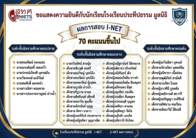 นักเรียน 43 คน ได้ผลสอบ I-NET ประจำปีการศึกษา 2568 ได้ตั้งแต่ 70 คะแนนขึ้นไป